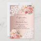 An elegant Confirmation invitation. A rose gold gradient background decorated with pink and rose gold florals, roses, lace and a golden cross. Personalise and add a name and details.