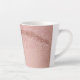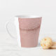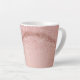 This latte mug features a rose gold glitter wave across a light pink background. The glitter has a metallic sheen and reflects light giving it a shimmering effect. The design glitter pattern is in a wave across the mug. The latte mug is a twelve ounce latte mug. The mug has a conical shape with an ear-shaped handle. The mug is microwave and dishwasher safe. The mug meets the FDA requirements for food and beverage safety.