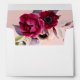 An envelope for wedding invitations, save the dates and thank you cards and summer party invitation. On front, outside: A white background. Inside: Blush pink, rose gold gradient background and large lush roses, flowers in burgundy, dark purple and rose gold.