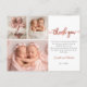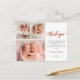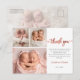 Modern Elegant Rose Gold Script Girl Twins Newborn Babies 3 Photo Collage Thank You Postcard. Featuring a beautiful "thank you" text in a cursive handwritten calligraphy swash tail font script in faux rose gold foil (or blush pink foil) and pre-made personal message. 3 Photo on front and at the back side (1) one full horizontal baby photo (with white overlay). Great for baby girl. Easy to personalise with your baby photos and details.