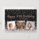 Elegant custom birthday card design featuring sparkly rose gold and silver confetti over a black background, modern script typography with the words "Happy 50th Birthday" and three of your favourite photos framed in metallic rose gold foil on the front of the card along with your message and closing on the back.