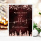 Welcome guests to your winter wedding with this elegant sign featuring faux rose gold glitter shimmering snowflakes and a forest of frosted pine trees. Set against a deep red burgundy background, the design exudes a magical winter wonderland ambiance. Perfect for a Christmas or winter wedding, this sign sets the tone for a festive and romantic celebration.