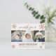 Add 3 photos to the front of this Merry Christmas postcard where a scatter of faux rose gold glitter snowflakes add charm to your holiday mailings. A faux white and grey wood background is the backdrop for a mix of fonts for a modern country holiday feel. All text is easy to personalise, from your names to the lower case Merry Christmas and "we wish you a" both in a pink rose gold tone handwritten script with subtle darker dusty pink drop shadows for interest to these holiday postcards. Just upload your three favourite pictures to these rose gold snowflake photo postcards for a unique way to send Christmas greetings to family and friends. The best Christmas photo postcards are easy to personalise and these winter themed rustic rose gold snowflake template postcards can be customised in a snap.