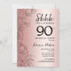 Rose Gold Surprise 90th Birthday Party Invitation. Glam feminine design featuring botanical accents and typography script font. Simple floral invite card perfect for a stylish female surprise bday celebration. Can be customised to any age. Printed Zazzle invitations or instant download digital template.