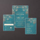 This elegant wedding invitation features rose gold line art floral cherry blossoms on a shimmering teal / turquoise background. Your photo on the backside.