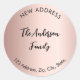We have moved, return address sticker. Personalise and add your family name, your new address. Curved text. Rose gold, blush pink background.