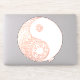 A beautiful hand drawn yin yang design filled with doodle art patterns in a rose gold tone.