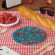 Rose hips, red and blue paper plate