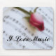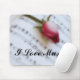 A single red rose bud lays across a sheet of music in a soft, dreamy, romantic original colour photograph. This mousepad makes a great gift for the music lover. Shown here is "I Love Music" text. Easily change the text and/or add a name to personalise.