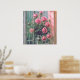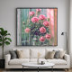 Artwork of some roses in a window. A charming still life painting featuring a bouquet of pink roses displayed in a transparent glass vase. The varying shades of pink in the blossoms, from soft blush to deeper rose, are rendered with delicate precision. Lush green leaves provide a vibrant contrast, while the window in the background hints at a tranquil indoor setting illuminated by gentle sunlight. This piece captures the ephemeral beauty of fresh flowers, making it a delightful addition to any art collection; adding a touch of warmth and peacefulness to any room. This artwork can be customised, printed, and or downloaded.