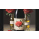 A beautifully arranged wine bottle surrounded by vibrant red roses.