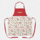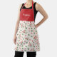 An apron with a pattern of rose hip and its red berries and green leaves on a light cream colour background and a customisable first name above on a red background. A lovely gift for a friend who loves berries. It could also be used in a store when you're working!