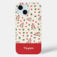 A phone case with a pattern of rose hip and its red berries and green leaves on a light cream colour background and, at the bottom, a customisable first name or text on a red background. A lovely gift for a friend who loves berries.