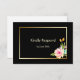 This wedding response card matches the Faux Glitter Gold Stripe Roses Wedding Invitations in our store. It features your custom text on a field of black, and enclosed within a thin shiny gold frame. A pink and peach rose embellishment decorates the bottom right. The back of the card has your custom text fields in black on a white background to make it easy for your respondent to mark.