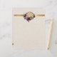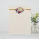 This is a full size letterhead. The background, front and back, is a natural oatmeal colour print image with light flecks. The header is a golden medallion trimmed with burgundy roses and holly, to add your message, monogram or image the year. The finish on the back bears a thin golden band accenting the end of the page design.