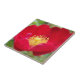 A macro photograph of a bright red single-petal miniature rose with a sunny yellow centre.