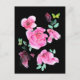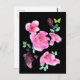 Pink roses and yellow butterflies against a stark black background