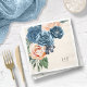 A bright, bold floral of roses in shades of dusty blue and peach is the focal point for many of the pieces of this wedding suite that also features elegant script text and modern design layouts. The wedding paper napkin shown here has a corner border of roses. Easily enter your wedding date and bride and groom's initials using the provided template. Search ID584 to see all the matching pieces in this beautiful wedding set.