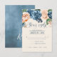 A bright, bold floral of roses in shades of dusty blue and peach is the focal point for many of the pieces of this wedding suite that also features elegant script text and modern design layouts. The wedding RSVP card shown here has an upper border of roses and a beautiful watercolor abstract on the reverse in dusty blue. Easily enter your wedding date and menu requirements using the provided template. Search ID584 to see all the matching pieces in this beautiful wedding set.