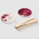 A bright, bold floral of roses in shades of burgundy and cream is the focal point for many of the pieces of this wedding suite that also features elegant script text and modern design layouts. The wedding hand fan shown here has a side border of roses and a beautiful watercolor abstract on the reverse in rich burgundy and plum. Easily enter your personal message and wedding ceremony details using the provided template. Search ID584 to see all the matching pieces in this beautiful wedding set.