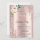 A modern, chic, and glamourous with rose gold glitter drips, and roses on a rose gold background.