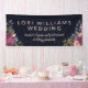 Welcome banner for a business/company in dark navy blue with trendy fonts and bohemian bouquets in blush pink, blue, green, and burgundy.
