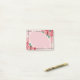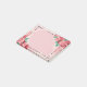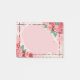 A pink post-it design with pink and red rose illustrations on the opposite diagonal edges and a black linear borders.