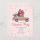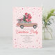 A valentine's party invitation featuring an illustration of a wood panelled pink suv truck topped with oversized rose bouquet. Background is light pink with confetti.