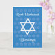 Send Rosh Hashanah blessings! A star of David pattern is seen on a blue background. A large white star of David is in the centre with the message. Wish peace, happiness, and good health for the new Jewish year.