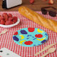 This pillow design has four different colourful fruits. The apple, banana, blueberry, and grape drawings are bright and fun.