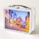 This is a standard metal lunchbox that appears to work just fine. We designed this box ourselves with an uploaded photo and custom text on the front and back. It looks absolutely beautiful except the front of the lunchbox is not centered like it shows in the photo. The print borders don't align with the inset flat part of the box where the preview photo online showed it perfectly centered in there. The back looks nice and centered though.