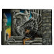 A Rottweiler dog is on guard on a castle ledge with a gargoyle griffin.