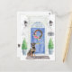 Announce your new address with our stylish announcement featuring a Rottweiler, blue front door, welcome mat, slate sign, topiaries and a floral wreath set on a grey brick background.