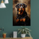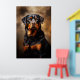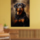 A majestic Rottweiler dog depicted with a gaze that conveys intelligence and a touch of solemnity. Set against a blurred background that ranges from light to dark hues, the dog's gleaming eyes and glossy black and tan coat stand out prominently.