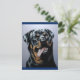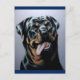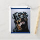 This fun canine postcard features a painted image of a happy brown and black Rottweiler dog highlighted with a blue background. This sweet pup is ready to help you let friends, family, and customers know your thinking of them.