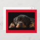This fun canine postcard features an image of a sleepy brown and black Rottweiler pup resting on a black background. Card is blank and will suit any occasion.