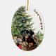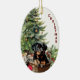 On the front of this Holiday ornament is the image an adorable Rottweiler puppy laying in his wicker basket bed in front of a decorated Christmas tree. Curved red text at the side says "CHRISTMAS". On the back, red and green text says MERRY CHRISTMAS", and there are additional text fields for you to customise to whatever you'd like.