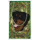 Smiling Rottweiler portrait set against a background of Christmas wreath.