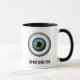 Blue Eye Iris © Sunny Mars Designs. Cool, fun custom printed blue eyeball novelty mug with a trendy, modern, beautiful, unique, freaky, creepy, weird and twisted graphic illustration of a striking big blue realistic eyeball iris of an eye. Other colour eyeball designs are also available in store.