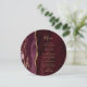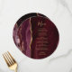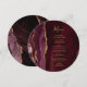 The left-hand edge of this elegant round modern wedding menu features a burgundy red watercolor agate border trimmed with faux gold glitter. The customizable text combines gold-colored handwriting script and copperplate fonts on a burgundy agate background. The reverse side features a matching burgundy and gold agate design.