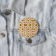 Round button featuring a colorful floral pattern with red, yellow, and green flowers on a white background. The back shows a metal pin.