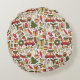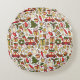 A soft round pillow covered in a colorful Christmas doodle pattern with playful illustrations such as snowmen, gifts, red cars, stars, stockings, holly, mittens, and Christmas trees. A perfect festive accent for cozy winter décor.