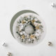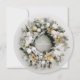 A round business holiday greeting cards features a beautiful snow flocked pine wreath decorated with white and gold Christmas tree ornaments and flowers on the front and a personalised message on the back on a green background. Be sure to double-check your order before adding it to your cart as what you see on the screen is what will be printed. The Live Design Service can help you with your design layout if needed.