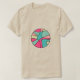 A black outlined circle divided by black lines into different colour areas creating a stylish original circular hard edge abstract motif.