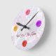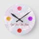 Round floral wall clock with "God Bless This Home" text on a background of flowers and colourful daisies.