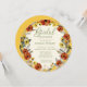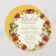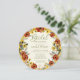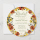 Circular bridal shower invitation embellished with earth tone flowers and leaves with a bright gold background. This unique invitation will set the tone for your fall (or any season!) celebration for the bride to be.