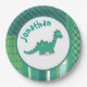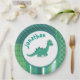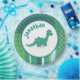Cute smiling dinosaur in round frame. Personalised name dino, blue green, teal colourful pattern for boys