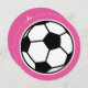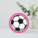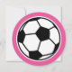 Round girls soccer Birthday party invitations. Soccer theme party invites for childrens Birthday, BBQ, tournament etc. Personalizable text and background colour ie girly neon pink. Cute soccer ball design with name and age of child. Whimsical typography. Personalise for sporty boy or girl players. Funny circle cut out shape. Kids toys and activities design for celebrations. Make circular invites for 4th 5th 6th 7th 8 th 9th 10th 11th 12th 13th Bday etc. Custom accessories for sports coach / soccer mum and dad.