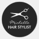 Round hairdresser stickers for hair stylist. Elegant design with professional barber scissors. Personalise with hairstylist name, business name, company name, hair salon, beautician etc.