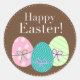 Round sticker reads: Happy Easter featuring decorated eggs.